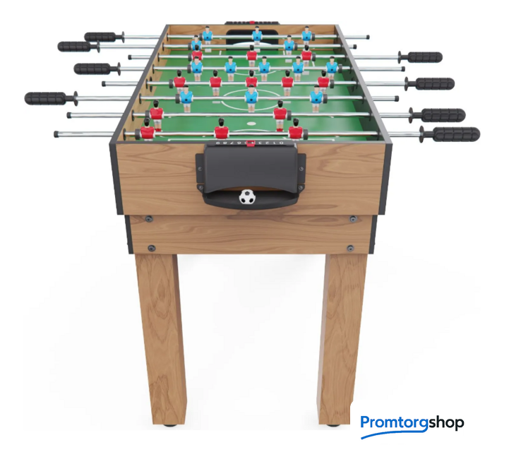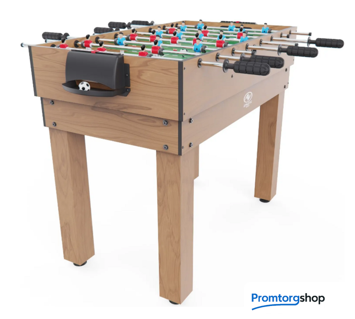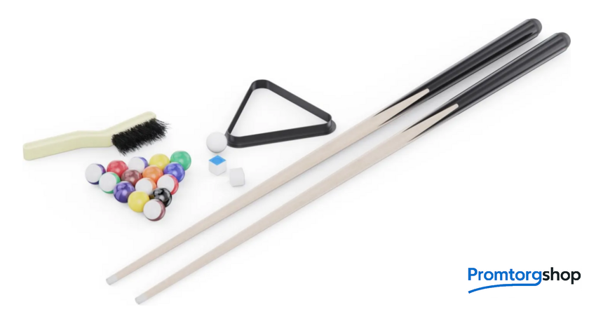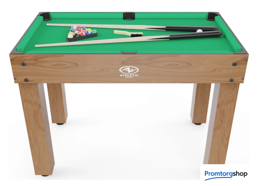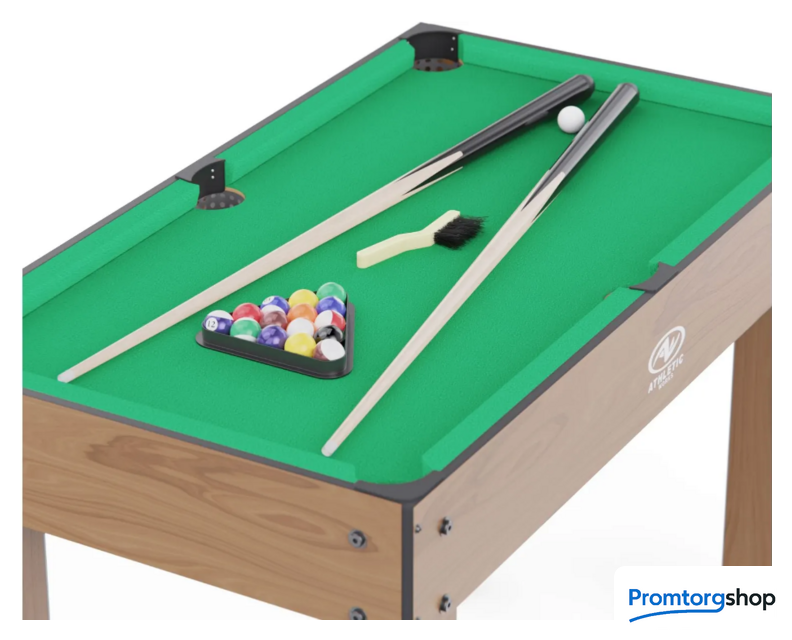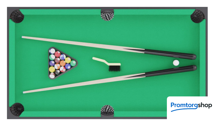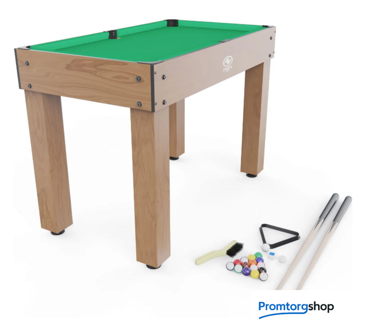 | Комплектация | 2 футбольных мячика, 2 теннисные ракетки, 2 мяча для настольного тенниса, комплект бильярдных шаров, треугольник для их выравнивания, 2 кия, щетка для ухода за покрытием и 2 мелка. |
