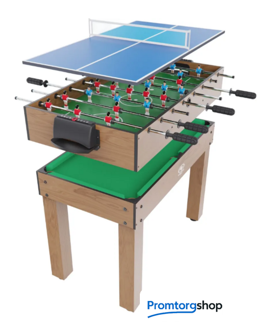 | Тип | игровой стол. Игровой стол — универсальный игровой стол, который сочетает в себе три самые популярные настольные игры: футбол, бильярд и настольный теннис. Благодаря компактным размерам он идеально подходит для домашнего использования, создавая атмосферу соревнования и весёлого досуга для всей семьи. Габариты стола — 124 х 61 х 81 см, высота ножек — 61 см. Стол выполнен из прочных материалов (МДФ и ПВХ), обеспечивающих надежность и устойчивость конструкции. Толщина игрового поля — 3 мм, а бортиков — 12 мм, что гарантирует долговечность и комфорт в игре. Каждая игра имеет своё игровое поле оптимального размера: Бильярд — 97.6 х 51 см. Настольный теннис — 103.7 х 57 см. Футбол — 104.8 х 58 см. Диаметр шаров и мячей: бильярдный и футбольный — 32 мм, теннисный — 40 мм. Ширина лузы для бильярда — 70 мм, длина кия — 91 см. В набор входят: 2 футбольных мячика, 2 теннисные ракетки, 2 мяча для настольного тенниса, комплект бильярдных шаров, треугольник для их выравнивания, 2 кия, щетка для ухода за покрытием и 2 мелка. Всё необходимое для начала игры — уже в комплекте. Игровой стол подарит море эмоций и позволит разнообразить досуг. Это отличный вариант для игр в компании друзей, семейных турниров и активного отдыха без выхода из дома |