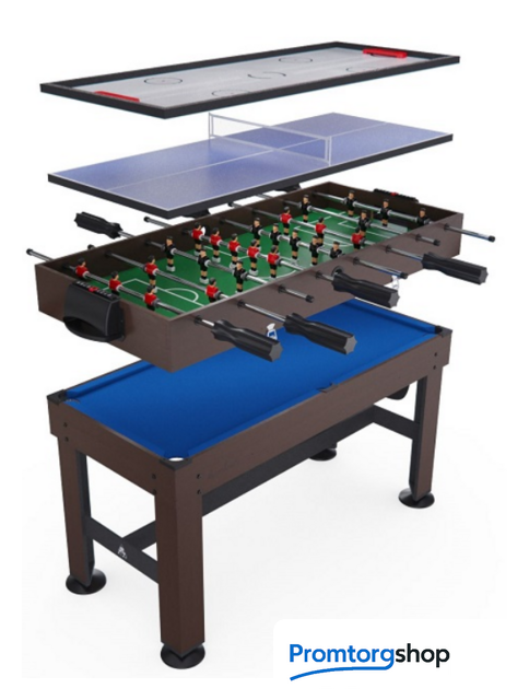 | Покрытие игрового поля | Толщина игрового поля 5 мм (бильярд, хоккей и настольный теннис), 3 мм (футбол). Толщина бортиков игрового поля: Аэрохоккей - 1,2 см |