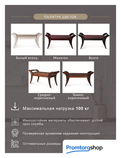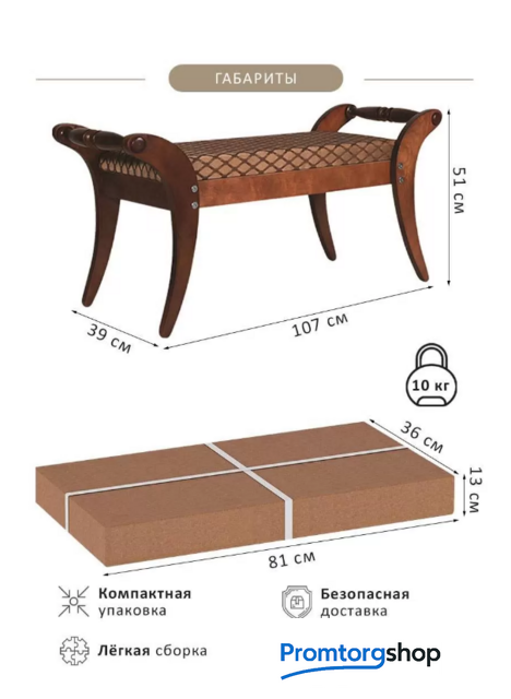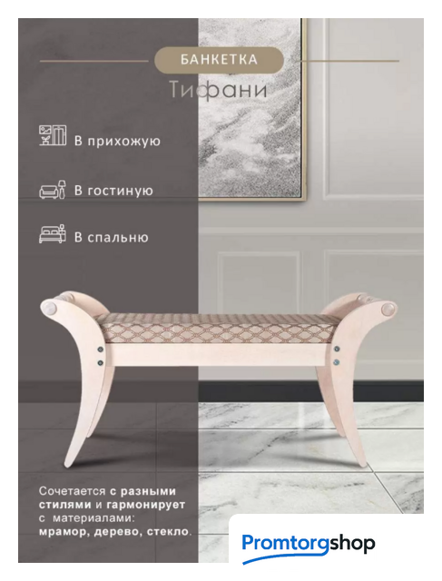 | Тип | Банкетка «Тифани» — предмет интерьера, пользу от которого вы почувствуете с первой минуты появления его в вашей обстановке. Простая по конструкции, внешнему виду, тем не менее, не лишена изящности за счет формы ножек стилизованных под перо, создающие эффект легкости, и привлекательности за счет правильно подобранных ткани обивки и цвета основания. Если принять во внимание еще два параметра — длину более метра и доступную цену, то эта банкетка — сразу станет той покупкой, впечатления от которой превзойдут ваши ожидания. Банкетка «Тифани» очень компактно упакована, транспортировать ее можно даже в общественном транспорте. При производстве использованы качественные материалы — массив березы, шпон березы, ткань жаккард, вспененный пенополиуретан, лак. |