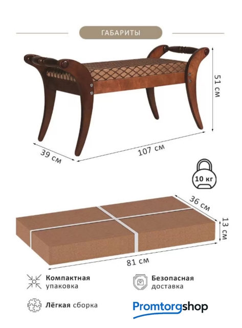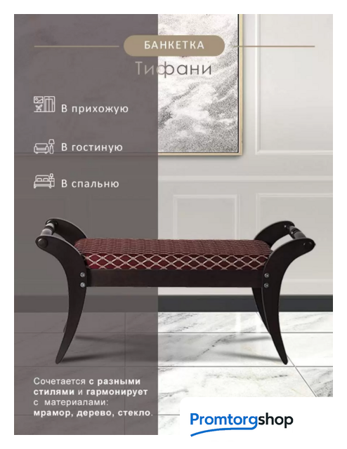 | Тип | Банкетка «Тифани» — предмет интерьера, пользу от которого вы почувствуете с первой минуты появления его в вашей обстановке. Простая по конструкции, внешнему виду, тем не менее, не лишена изящности за счет формы ножек стилизованных под перо, создающие эффект легкости, и привлекательности за счет правильно подобранных ткани обивки и цвета основания. Если принять во внимание еще два параметра — длину более метра и доступную цену, то эта банкетка — сразу станет той покупкой, впечатления от которой превзойдут ваши ожидания. Банкетка «Тифани» очень компактно упакована, транспортировать ее можно даже в общественном транспорте. При производстве использованы качественные материалы — массив березы, шпон березы, ткань жаккард, вспененный пенополиуретан, лак. |