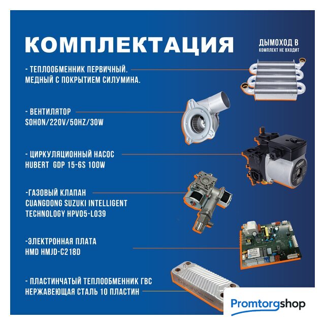 Вид | газовый конвекционный. Патрубок подключения газа 1/2 ". Патрубок подключения контура отопления 3/4 ". Патрубок подключения контура ГВС 1/2 ". Диаметр дымохода 60/100 мм |