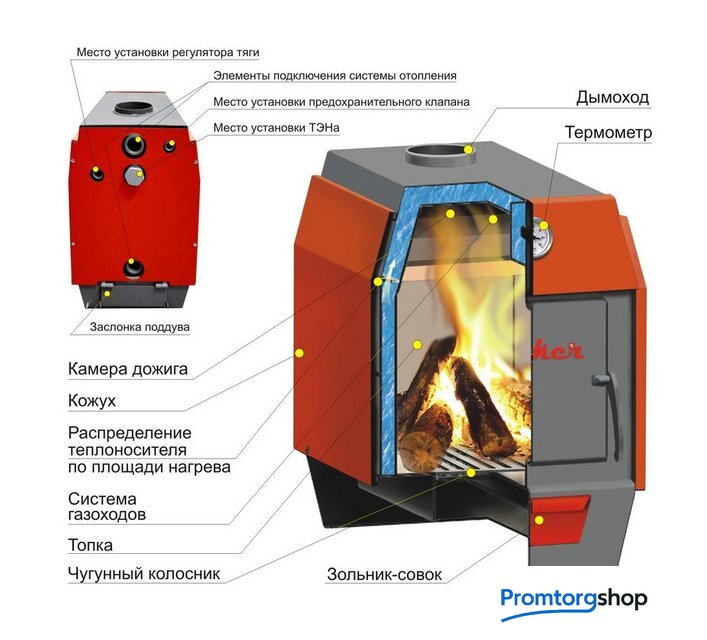 | Вид | твердотопливный. Дополнительные опции возможность установки ТЭНа, энергонезависимый. Диаметр дымохода 130 мм. Патрубок подключения контура отопления 1 1/4" |