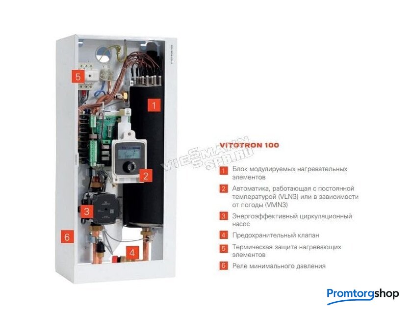 | Вид | Циркуляционный насос в комплекте. Электрический котел Vitotron 100 может быть основным теплогенератором или же выполнять функцию резервного нагревательного источника в доме, где главным является газовый или жидкотопливный котел. Сохраняя низкие эксплуатационные расходы, Vitotron 100 обеспечивает высокий комфорт использования и гарантирует, что во время отсутствия людей в доме будет поддерживаться температура, позволяющая избежать замерзания системы в здании. Vitotron 100 может использоваться с любыми типами систем отопления и емкостных водонагревателей. Котел оборудован расширительным баком вместительностью 5 литров и необходимой защитной арматурой. При комбинации котла с емкостным водонагревателем возможно регулирование температуры воды и включение циркуляционного насоса согласно настроенным суточным и недельным программам. |
