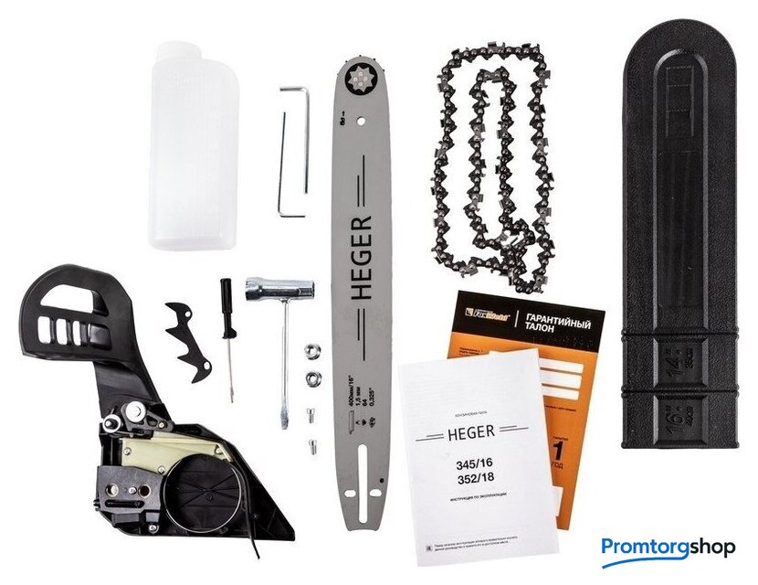 | Комплект поставки | - бензопила в разборе - 1 шт.- крышка с инерционным тормозом цепи с крепежом - 1 шт.- пильная шина 16 дюймов - 1 шт.- пильная цепь 16 дюймов - 1 шт.- пластиковый чехол для пильной шины - 1 шт.- пластиковая бутылка для приготовления топливной смеси - 1 шт.- металлический зубчатый упор с крепежом - 1 шт.- ключ свечной комбинированный - 1 шт- отвёртка шлицевая - 1 шт.- ключ шестигранный - 2 шт.- инструкция по эксплуатации + гарантийный талон - 1 шт. |