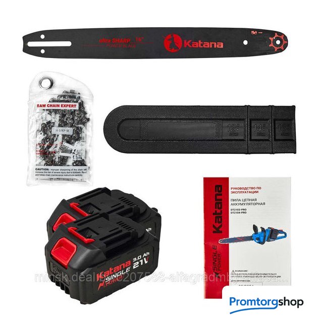 Комплект поставки | Пила цепная аккумуляторная Katana - 1 шт. - Инструкция по эксплуатации с гарантийным талоном - 1 шт. - Цепь пильная - 1 шт. - Шина цепи - 1 шт. - Защитный чехол - 1 шт. - Зарядное устройство - 1 шт. - Аккумуляторная батарея - 2 шт. |