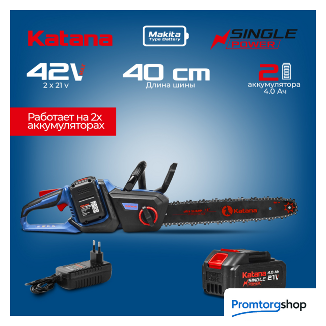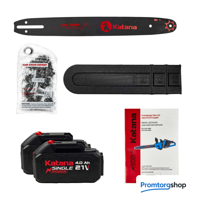 | Комплект поставки | Пила цепная аккумуляторная Katana - 1 шт. - Инструкция по эксплуатации с гарантийным талоном - 1 шт. - Цепь пильная - 1 шт. - Шина цепи - 1 шт. - Защитный чехол - 1 шт. - Зарядное устройство - 1 шт. - Аккумуляторная батарея - 2 шт. + Шуруповерт аккумуляторный(отв-ка)KATANA SW5000 |