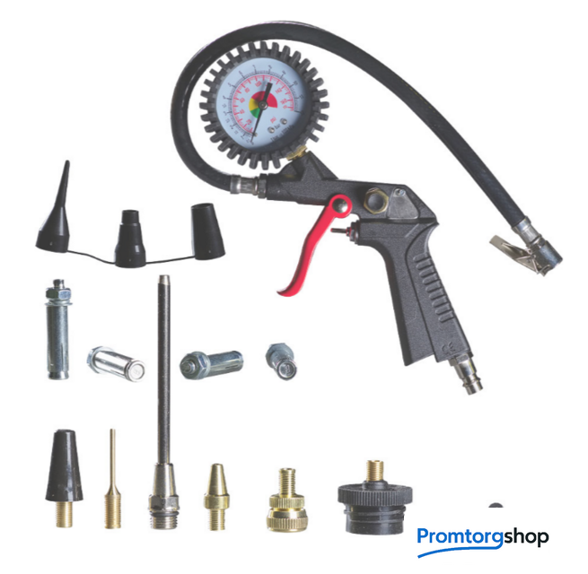 | Комплектация | пистолет для накачки шин с манометром, насадка для продувки, переходник (3 шт.), наконечники, шланг (9 м) |