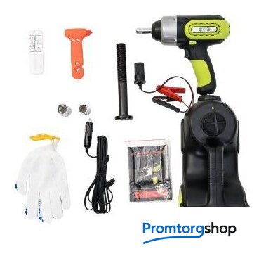 Комплект поставки | - Компрессор со встроенным домкратом до 5 т;- Гайковерт на 2 головки: 19 и 21 мм;- Кабель для подключения от прикуривателя;- Кабель для подключения от клемм АКБ;- Перчатки 1 пара;- Автомобильный аварийный молоток- Пульт дистанционного управления- Кейс. |