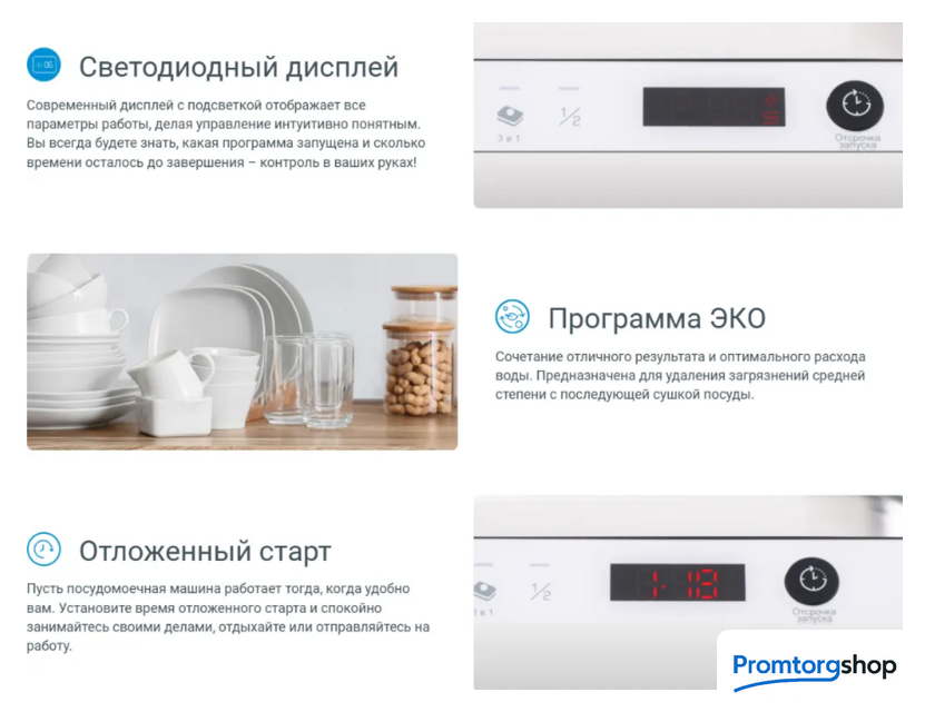 | Исполнение | Встраиваемая посудомоечная машина DIS 1C28 — компактная модель шириной 44.8 см на 9 комплектов посуды, которая легко встраивается в стандартный кухонный гарнитур, не нарушая его целостности. Модель оснащена 5 программами: интенсивный режим при 70°С справится с сильными загрязнениями, а cпециальная программа Push&Go (нажмите и запустите) позволит запустить ежедневный цикл всего за пару секунд нажатием одной кнопки. Светодиодный дисплей показывает выбранную программу и оставшееся время цикла, позволяя контролировать процесс, а индикаторы соли и ополаскивателя своевременно сообщат о необходимости пополнить запасы. Функция половинной загрузки во встраиваемой посудомоечной машине DIS 1C28 позволяет запустить мойку даже при небольшом количестве посуды, экономя воду и электроэнергию, а функция отложенного старта на 3, 6 или 9 часов дает возможность запланировать цикл мойки и запустить его в удобное время. |