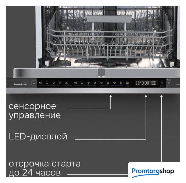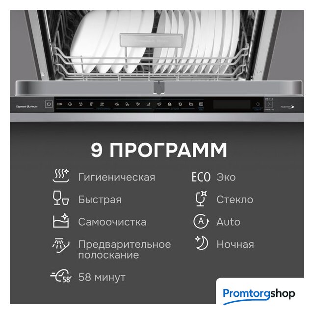 | Дополнительные опции | сокращение времени мойки, дополнительная сушка, усиление интенсивности мойки (гигиеническая мойка), половинная загрузка (экономия воды), программа самоочистки |