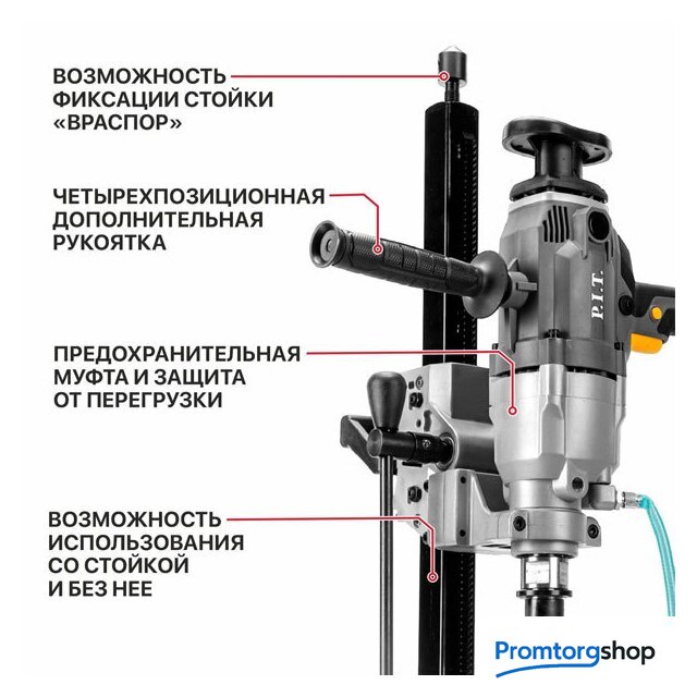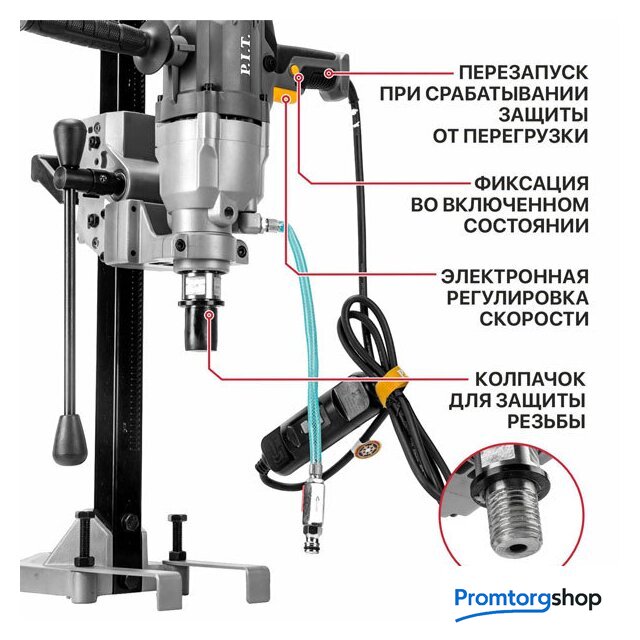 | Режимы работы | мокрое сверление. Интегрированный штуцер подачи воды. Подача воды может осуществляться как с помощью ручного нагнетательного насоса, так и из водопровода. |