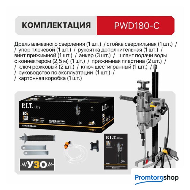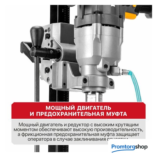 | Комплектация | Дрель алмазного сверления, стойка сверлильная, упор плечевой, рукоятка дополнительная, винт прижимной, анкер (3 шт.), шланг подачи воды с коннектером (2,5 м), прижимная пластина (2 шт.), ключ рожковый (2 шт.), ключ шестигранный, сумка для переноски, руководство по эксплуатации, коробка. |