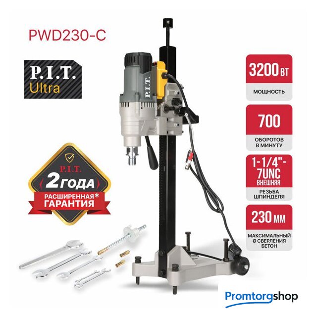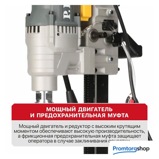 Тип | Дрель алмазного сверления серии ULTRA PWD230-C предназначена для мокрого сверления алмазными коронками отверстий в бетоне, железобетоне, искусственном и природном камне, кирпичной и каменной кладке с подачей воды. Мощный двигатель и редуктор с высоким крутящим моментом обеспечивают высокую производительность, а фрикционная предохранительная муфта защищает оператора в случае заклинивания оснастки. Подача воды может осуществляться как с помощью ручного нагнетательного насоса, так и из водопровода. Защита от перегрузки предотвращает перегрев двигателя при чрезмерно высоких нагрузках. Преимущества: ● Инструмент серии ULTRA ● Защита от перегрузки ● Предохранительная муфта ● Фиксация включенного состояния ● Мокрое сверление ● Устройство защиты от поражения током PRCD ● Интегрированный в корпус штуцер подачи воды ● Лёгкий доступ к щеткам ● Двойная изоляция для защиты от поражения электрическим током. ● Сверлильная стойка в комплекте |