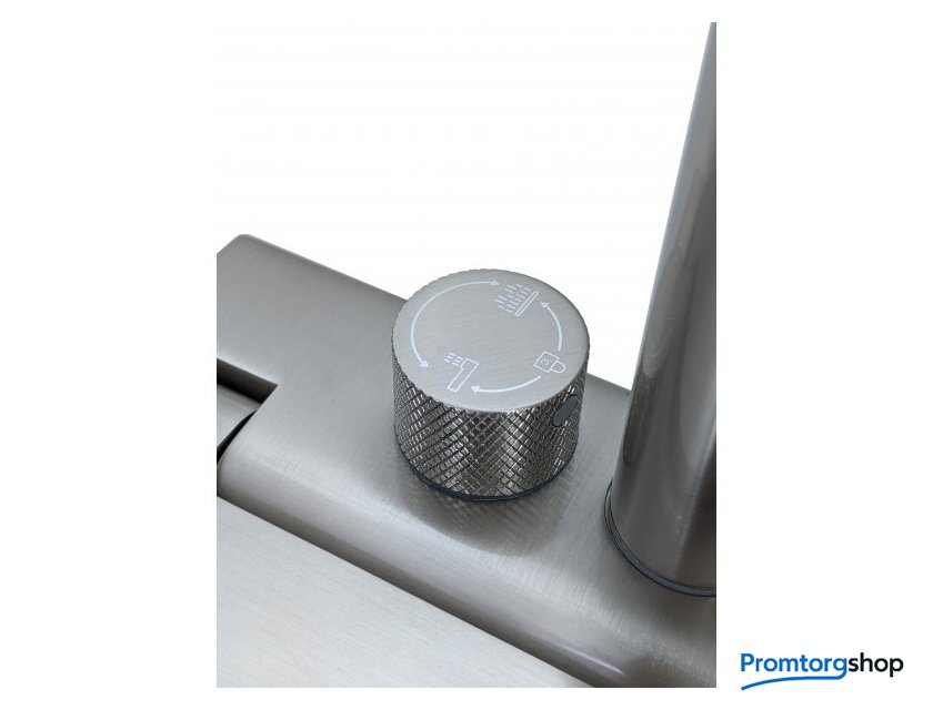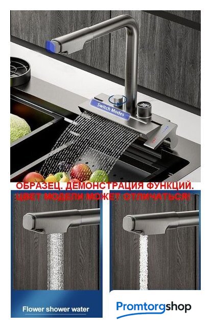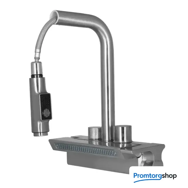 | Другие особенности | -блок-водопад, поднимается верх-вниз -переключение потока воды носик или водопад через поворотную плашку -плашка с дисплеем, отображает температуры воды, работает без сети и батареек, работает от встроеного механизма от потока воды -холодная и горячая вода, а также напор регулируются ручкой справа |
