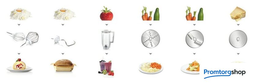 | Функции | блендер, взбивание, смешивание, замешивание дрожжевого теста, терка, шинковка, ломтерезка |