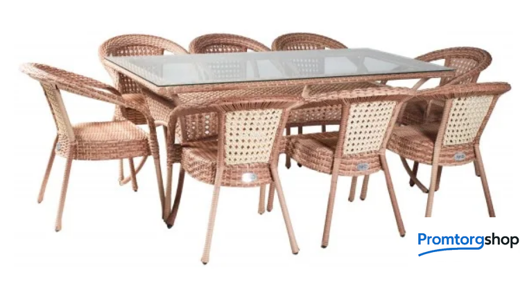 | Тип | обеденная группа. Комплект плетеной мебели из искусственного ротанга на 8 персон. Не боится влаги, прямых солнечных лучей, мороза. Не требует особого ухода. Легко моется. Рекомендованная температура эксплуатации -16/+50. Нить плоская. В комплекте : стол обеденный прямоугольный , 8 кресел. Подушки можно приобрести отдельно. Гарантия 2 года! Комплект для большой компании. Подходит для загородного дома, дачи или летней площадки во дворе. |