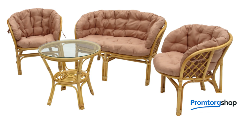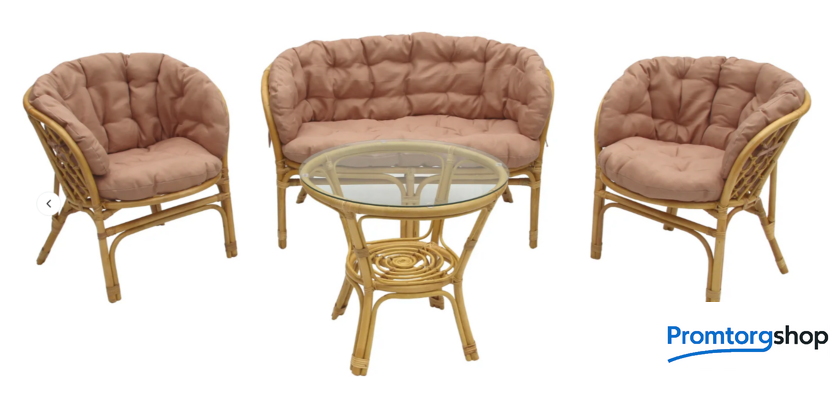 | Материал основания | натуральный ротанг (покрытие лак). Максимальная нагрузка мебели для сидения 90 кг. Максимальная нагрузка на стол 30 кг |