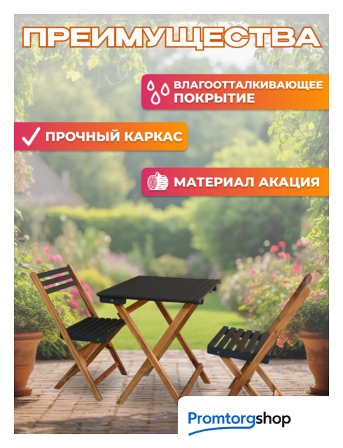 | Тип | комплект садовой мебели для веранды/загородного дома, для кафе/ресторана/отеля, для лоджии/балкона. Форма поставки в разобранном виде. Элегантный набор садовой мебели станет прекрасным дополнением к вашему ландшафтному дизайну. Его лаконичный дизайн и природные материалы гармонично впишутся в любую обстановку, будь то утопающий в зелени сад, просторная терраса или зона отдыха у бассейна. Продуманная конструкция обеспечивает комфорт и удобство использования, а компактные размеры позволяют разместить комплект даже на небольшом участке. Древесина акации, из которой изготовлена мебель, отличается не только своей красотой и текстурой, но и высокой прочностью и долговечностью. Специальная влагоотталкивающая пропитка защищает ее от воздействия атмосферных осадков, перепадов температур и солнечных лучей, что позволяет мебели сохранять свой первоначальный вид на протяжении многих лет. |