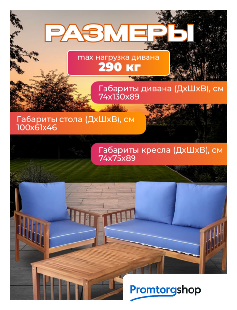 | Состав набора | диван, кресло (2 шт.), столик (кофейный, на 4 персоны). Максимальная нагрузка мебели для сидения 290 кг (на диван); 145 кг (на кресло) |