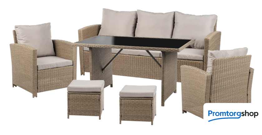| Состав набора | стол, кресло (2 шт.), пуф (2 шт.), диван |