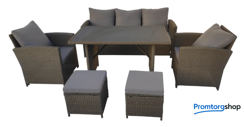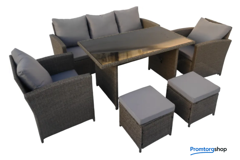 | Тип | набор для отдыха для веранды/загородного дома на 7 чел. Форма поставки в разобранном виде. Комплект садовой мебели из шести предметов создает комфортную зону отдыха для загородного дома, веранды, террасы или сада. В набор входят прямоугольный стол, диван, два кресла и два пуфа, что позволяет разместить до семи человек. Мебель выполнена в стиле плетения из искусственного ротанга серого цвета с металлическим каркасом. Использование прочных материалов способствует долговечности, устойчивости к погодным условиям и УФ-излучению и сохранению внешнего вида. Столешница из закаленного стекла толщиной 5 мм имеет черный цвет, а мягкие сиденья и спинки дополнены подлокотниками. Текстильные подушки цвета капучино входят в комплект — семь для сиденья и пять для спинки. Продуманные габариты предметов позволяют эффективно использовать пространство, создавая просторную и функциональную зону для приема гостей. Диван имеет размеры 168×67×75 см, стол — 130×75×69 см, кресла — 68×67×75 см, а компактные пуфы — 40×40×30 см. Общий вес комплекта составляет 78 кг, мебель поставляется в разобранном виде в двух упаковках. Сочетание прочной конструкции, устойчивого к внешним воздействиям плетения и продуманной эргономики формирует гармоничное пространство для отдыха. Комплект мебели для сада объединяет практичность и современный дизайн, создавая атмосферу уюта на открытом воздухе. |
