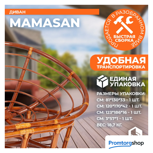 | Материал основания | натуральный ротанг. Максимальная нагрузка 130 кг. Форма поставки в разобранном виде |