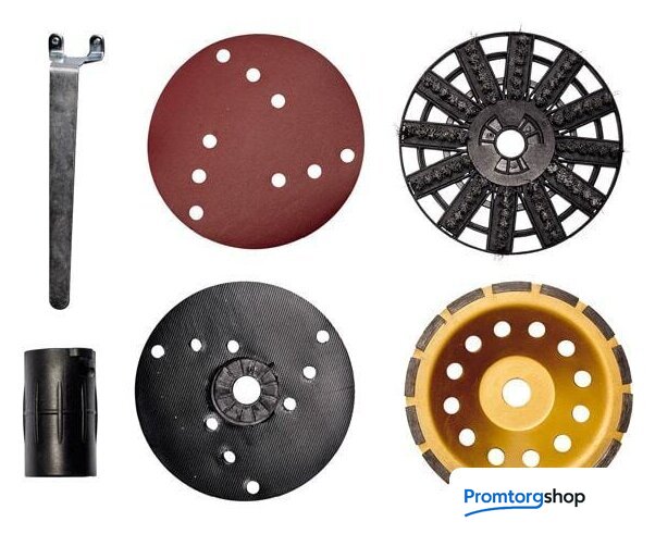 Комплект поставки | основание для шлифовальных дисков с креплением «липучка»алмазная шлифовальная чашка для шлифовки бетона, штукатурки и камнястальная чистящая щетка для зачистки стен от обоев и шлифовки бетона6 шлифовальных дисков |