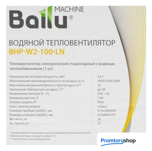 | Производительность | 4400 м³/ч. Водяной тепловентилятор Ballu BHP-W2-100-LN НС-1303791 - прибор для обогрева складских и промышленных помещений большой площади с высотой потолков более 6 метров. Максимальная рабочая температура теплоносителя 130°С при давлении 15 бар, что позволяет использовать в качестве теплоносителя пар и перегретую воду. Осевой вентилятор диаметром 450 мм создает воздушный поток длиной 22 метра и обеспечивает максимальную производительность до 4400 м3/ч. В летнее время года водяной тепловентилятор можно использовать в качестве файнкола, для этого необходимо подключить его к источнику холодной воды. |