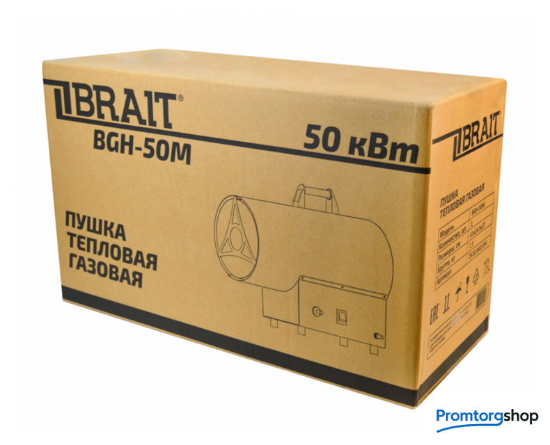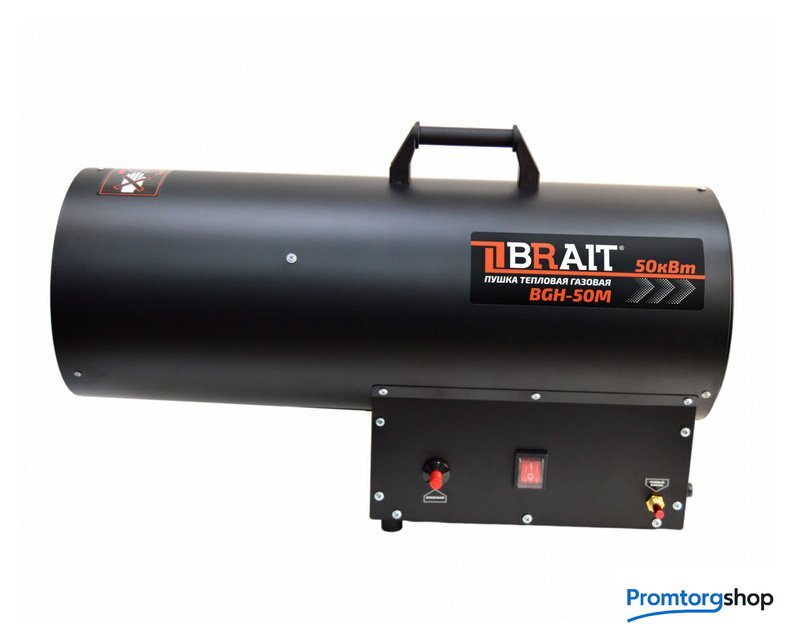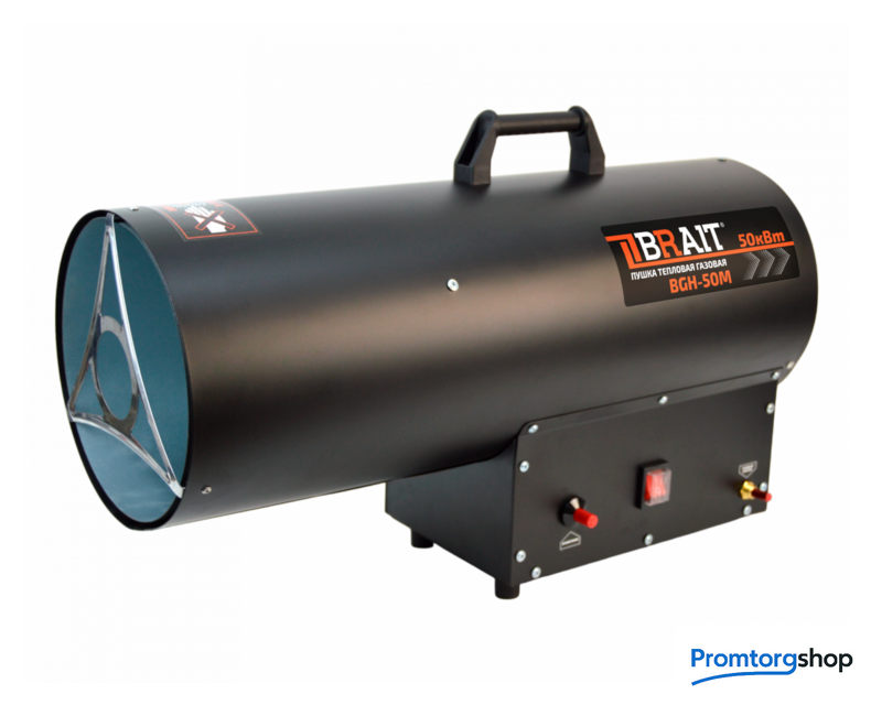 Тип | Пушка тепловая газовая BGH-50M служит для обогрева открытых площадок и вентилируемых помещений, широко используется на строительных площадках, а так же эффективна для монтажа натяжных потолков, просушки окрашенных и оштукатуренных стен. Специальная ручка. Делает переноску устройства удобной. Система пьезорозжига. Обеспечивает безопасное использование, так как не создает огня на поверхности зажигания. Защитная решетка на сопле. Предотвращает попадание посторонних предметов внутрь пушки. Защита. Кнопка включения и выключения с защитой от влаги и пыли. ПРЕИМУЩЕСТВА: Идеально подходит для установки натяжных потолков. Экологически чистая, высокопроизводительная пушка для обогрева производственных и складских помещений. Тепловая пушка для производственных и складских помещений. Высокая тепловая мощность благодаря энергоемкому рабочему телу (газ). Высокий уровень КПД, близкий к 100%. Низкое энергопотребление способствует экономичности. Качественная горелка гарантирует эффективное бесперебойное горение и долгий срок службы. Зажигание от пьезоэлемента обеспечивает надежный поджиг горелки при минимальных потерях газа. Цилиндрическая форма корпуса оптимальна для равномерности воздушного потока. Мощный двигатель вентилятора способствует увеличению теплоотдачи изделия за счет большого объема прокачиваемого воздуха. ПРИНЦИП РАБОТЫ ГАЗОВОЙ ПУШКИ: Конструкция газовой тепловой пушки включает в себя два основных элемента: в металлический корпус помещается газовая горелка для сжигания топлива с образованием тепловой энергии и вентилятор, который нагнетает воздух в корпус и выводит наружу нагретые воздушные массы. Сжиженный газ испаряется из баллона, переходит в газообразное состояние и попадает по шлангу к горелке, он поджигается с помощью пьезоэлемента. При сгорании пропан-бутановой смеси образуются только углекислый газ и вода, нет токсичных примесей. Из-за этого помещение, где работает такой обогреватель, должно постоянно проветриваться. Приток уличного воздуха также обеспечивает необходимое для горения количество кислорода, это поможет предотвратить ощущение духоты. КОМПЛЕКТАЦИЯ: Газовая пушка в сборе. Ручка для переноски - 1 шт. Газовый шланг - 1 шт. Редуктор давления - 1 шт. Инструкция по эксплуатации - 1 шт. Поставялется в коробке. |