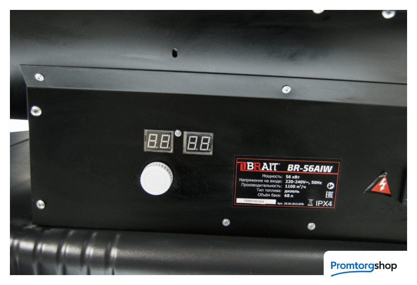 | Тип | Пушка тепловая дизельная BRAIT BR-56AIW (непрямой нагрев) предназначена для обогрева значительных площадей. Работает на дизельном топливе или керосине, поэтому ее можно использовать на строительных объектах, в промышленных помещениях или гаражах вдали от городских коммуникаций. Тепловое оборудование на дизельном топливе используется во многих отраслях как способ получения основного или дополнительного тепла. Оно является наиболее удобными, эффективными и экономичными в эксплуатации. Главное отличие пушек непрямого нагрева – закрытая камера сгорания, отделенная перегородкой от подаваемого воздуха. Благодаря такой конструкции продукты сгорания солярки не попадают в выходящую воздушную струю, а отводятся через патрубок, соединенный с дымоходной или вытяжной трубой или вентиляционным каналом. ПРЕИМУЩЕСТВА: Надежная и высокопроизводительная пушка для обогрева производственных и складских помещений. Низкое энергопотребление способствует экономичности. Качественная горелка гарантирует эффективное бесперебойное горение и долгий срок службы. Камера сгорания повышенной толщины из жаропрочной стали. Дисплей отображает внешнюю температуру, процесс самотестирования при включении, выдает код ошибки при отказе одной из систем управления. Теплоотражающий стальной экран в передней торцевой части корпуса задерживает открытое пламя и не даёт ему вырываться наружу, тем самым обеспечивая равномерный нагрев помещения, либо рабочей поверхности. Объём дизельного топлива измеряется датчиком уровня, что облегчает контроль расхода топлива. Колеса и ручка обеспечивает удобство транспортировки и хранения. |