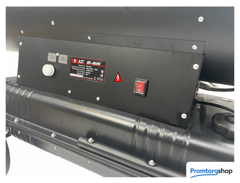 | Тип | Дизельная тепловая пушка BRAIT BR-86AW – это мощный обогреватель, работающий на дизельном топливе. Предназначена для обогрева нежилых помещений и локального прогрева рабочих поверхностей. ПРЕИМУЩЕСТВА: Надежная и высокопроизводительная пушка для обогрева производственных и складских помещений. Высокий уровень КПД, близкий к 100% за счет прямого нагрева. Низкое энергопотребление способствует экономичности. Качественная горелка гарантирует эффективное бесперебойное горение и долгий срок службы. Камера сгорания повышенной толщины из жаропрочной стали. Дисплей отображает внешнюю температуру, процесс самотестирования при включении, выдает код ошибки при отказе одной из систем управления. Теплоотражающий стальной экран в передней торцевой части корпуса задерживает открытое пламя и не даёт ему вырываться наружу, тем самым обеспечивая равномерный нагрев помещения, либо рабочей поверхности. Объём дизельного топлива измеряется датчиком уровня, что облегчает контроль расхода топлива. |