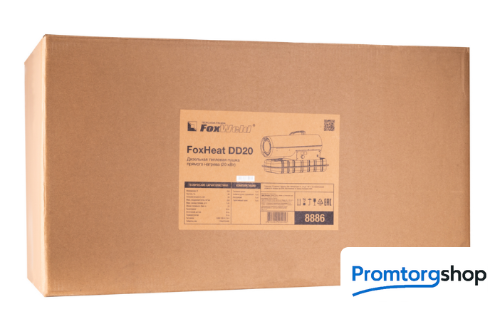 | Тип | Дизельная тепловая пушка прямого нагрева FoxHeat DD 20 [20 кВт] предназначена для обогрева промышленных, строительных, сельскохозяйственных объектов, в том числе складских помещений (ограниченно). По принципу действия устройство является обогревателем прямого нагрева, то есть продукты сгорания вместе с воздушным потоком попадают в обогреваемое помещение. Также важно помнить, что во время горения дизельного топлива в отапливаемом помещении выгорает кислород. В отличие от газовых пушек в выхлопе дизельных пушек может присутствовать угарный газ, ядовитый для человека. По этим причинам газовая пушка предназначена для обогрева только нежилых строений, открытых площадок или хорошо проветриваемых помещений. По эффективности обогрева дизельные пушки являются безусловным лидером благодаря мощному воздушному потоку, современным эффективным камерам сгорания, и относительно недорогому дизельному топливу. Устройство выполнено в надёжном жаропрочном корпусе и съёмной ручкой для удобной переноски между рабочими зонами. Удобная контрольная панель снабжена двумя дисплеями для отображения заданной температуры и температуры воздуха в обогреваемом помещении. Реализована функция "климат-контроль": при достижении заданной температуры устройство переходит в режим ожидания и вновь стартует при отклонении от неё. Уровень топлива можно отслеживать через встроенный указатель. Подача топлива, поджиг, контроль горения полностью автоматизированы. Безопасность работы обеспечена защитой от перегрева, защитой от отключения питания, защитой от затухания пламени и контролем пустого. В каждом из этих случаев моментально будет блокирована подача топлива в камеру сгорания с выводом соответствующего кода ошибки на один из дисплеев. Высокотехнологичная камера сгорания из нержавеющей стали с активным охлаждением, производительный топливный насос, эффективный топливный фильтр, впрыск под низким давлением позволяют полностью сжигать горючую смесь, увеличивая эффективность пушки и делая выхлоп чище. Максимальная тепловая мощность достигает 20 кВт при скорости воздушного потока 550 куб м / ч. Устройству необходимо подключение к бытовой розетке 16А/230В для обеспечения работы вентилятора, создающему поток воздуха для обогрева помещения, а также обеспечивающему подачу кислорода, необходимого для горения топлива. Топливо: дизельное топливо, соответствующее ГОСТ 305-82. ВНИМАНИЕ. Несмотря на многоуровневую систему защиты, данное устройство требует постоянного контроля со стороны пользователя. ВНИМАНИЕ. ОСТОРОЖНО. Необходимо соблюдать осторожность и базовые правила безопасности при работе с нагревательными приборами! Пожалуйста, прочтите инструкцию по эксплуатации перед использованием устройства. ЗАПРЕЩЕНО накрывать устройство во время работы, а также в выключенном состоянии до полного остывания в исполнение требований правил пожарной безопасности. Пожалуйста, прочтите инструкцию по эксплуатации перед использованием устройства. ОСОБЕННОСТИ: Прямой нагрев: для обогрева нежилых строений, открытых площадок или хорошо проветриваемых помещений Максимальная тепловая мощность 20 кВт Макс. воздушный поток 550 куб. м / час Трёхуровневая безопасность (защита от перегрева, отключения питания, затухания пламени) Удобная контрольная панель с двумя 