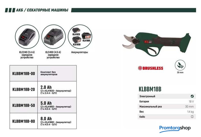Тип | Профессиональный аккумуляторный секатор KLPRO KLBBM18B — это мощный и надёжный инструмент для обрезки деревьев и кустарников в саду или на приусадебном участке. Основные характеристики: Батарея 18 Вольт в комплекте (2 шт.) обеспечивает высокую производительность и позволяет работать без подзарядки длительное время. Максимальный рез — 30 мм позволяет обрезать ветви и стебли разной толщины. Вес 1,4 кг делает секатор удобным в использовании и не утомляет руку даже при длительной работе. Электронный — инструмент оснащён современной электроникой и бесщёточным двигателем, что обеспечивает точную и эффективную обрезку. Секатор KLPRO KLBBM18B — это отличный выбор для профессиональных садоводов и любителей, которые ценят качество, надёжность и удобство в работе. С ним вы сможете быстро и легко поддерживать свой сад в идеальном состоянии. |
