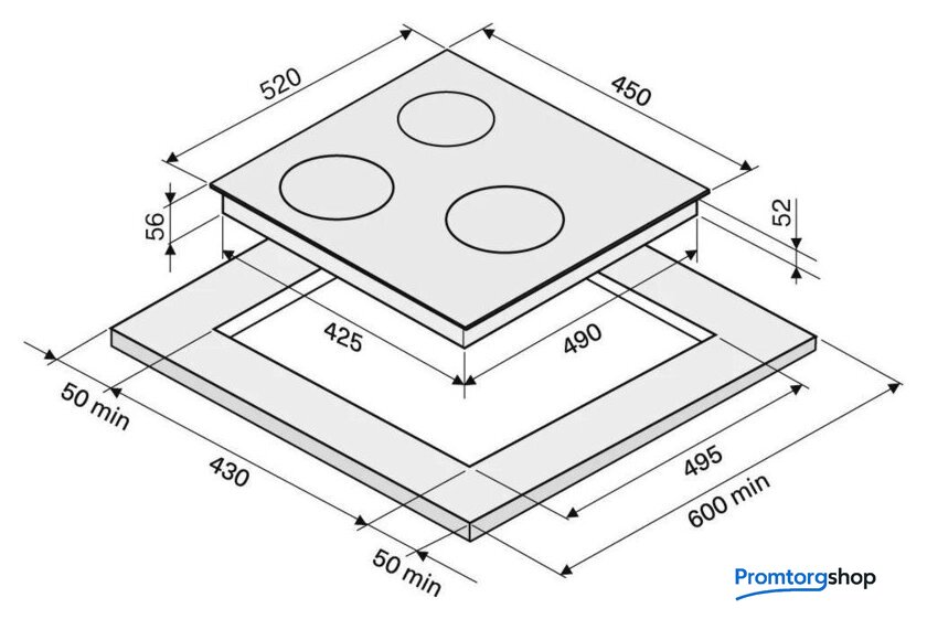 | Подробная информация о конфорках | Дальняя левая: 160 мм * 1,3/1,5 кВт; Ближняя левая: 160 мм * 1,3/1,5 кВт; Центральная правая: 180 мм * 1,8/2,2 кВт |
