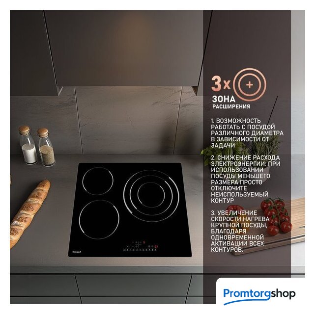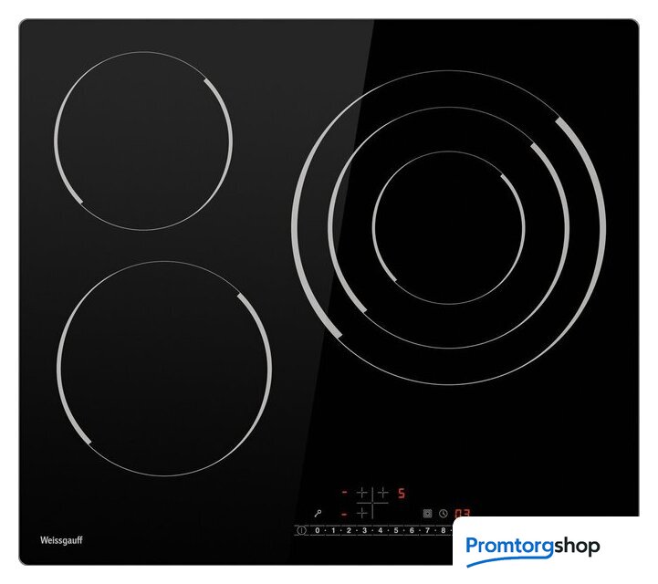 Подробная информация о конфорках | 3 конфорки: 1x 165 мм*1,2 кВт (задняя левая), 1х 200 мм*1,8 кВт (передняя левая), 1 х 140/210/300 мм*1,05/1,95/2,7 кВт (тройной контур) |