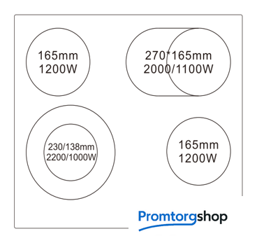 Подробная информация о конфорках | 2x165 мм (1200 Вт)1x165x270 мм (1100/2000 Вт)1x138-230 мм (1000-2200 Вт) |