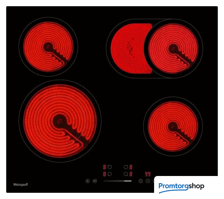 Подробная информация о конфорках | 4 конфорки: 1x230/138 мм*2,2/1 кВт (двойной контур),1х270/165мм*2/1,1 кВт (гусятница), 2х165 мм*1,2 кВт |