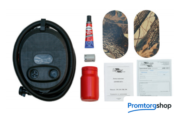 | Комплектация | Дополнительная комплектация весло (разъемные алюминиевые, 2 шт.), насос, ремкомплект (оригинальный клей, небольшие кусочки ПВХ материала и пластиковый), сумка упаковочная (гермобаул), руководство по эксплуатации (паспорт), банка (сиденье) (из фанеры толщиной 18 мм) Бортовое оснащение леерный трос, уключины для весел |