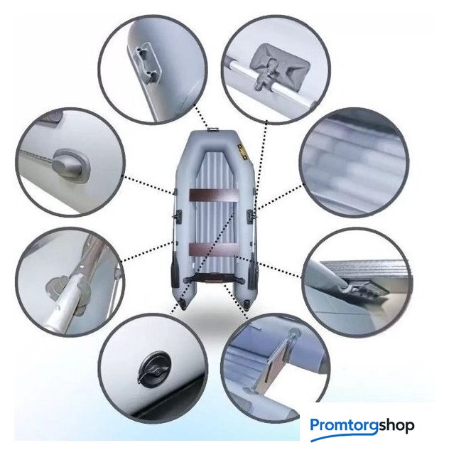 | Комплектация | весло (2 шт.), насос (ножной), ремкомплект, сумка упаковочная, руководство по эксплуатации (паспорт), банка (сиденье) (2 шт.), клапан для сброса давления (+ предохранительный для избыточного), леерный трос, ручки для переноски, уключины для весел, привальный брус |
