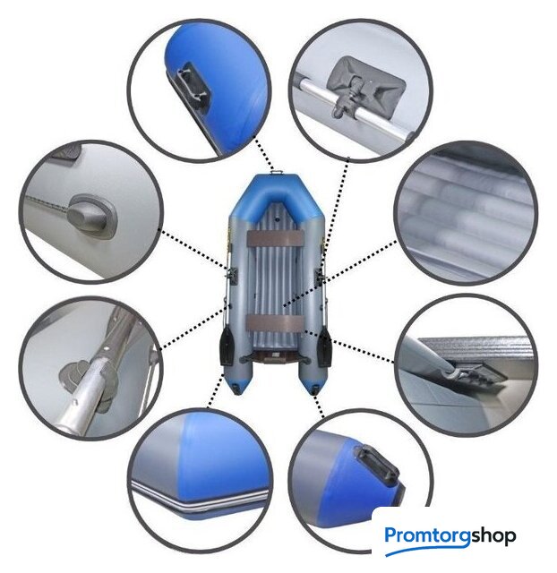 | Комплектация | весло (2 шт.), насос (ножной), ремкомплект, сумка упаковочная, руководство по эксплуатации (паспорт), банка (сиденье) (2 шт.), клапан для сброса давления (+ предохранительный для избыточного), леерный трос, ручки для переноски, уключины для весел, привальный брус |