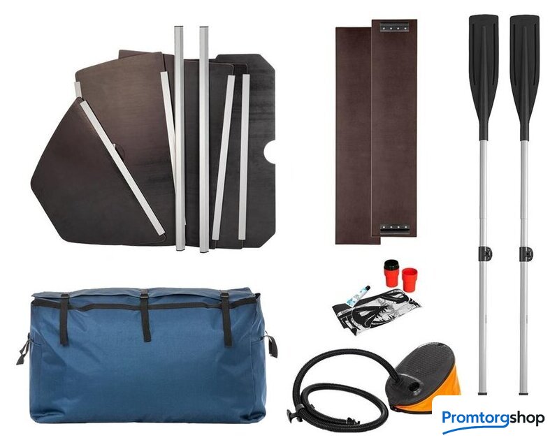| Комплектация | • Ножной насос 7 л.• 2 весла с держателями весла в уключине.• 2 жестких сиденья.• Пайол (5 секций жесткого настила).• Стрингер продольный (2 штуки).• Сумка упаковочная.• Ремкомплект и руководство по эксплуатации (паспорт) |