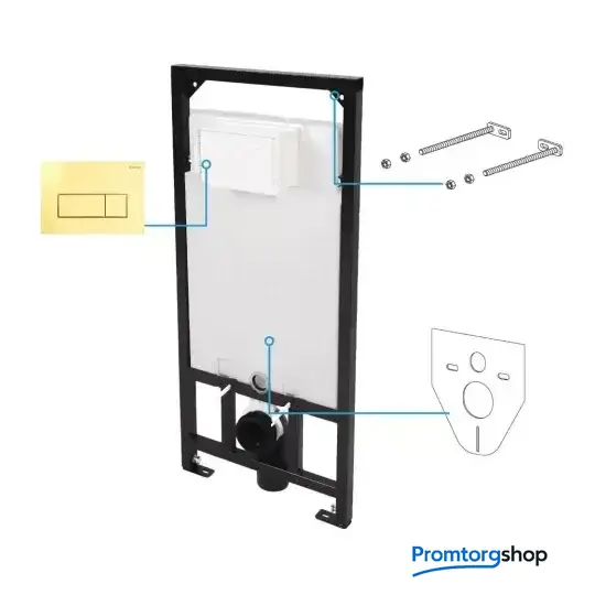 Конструкция | рамная. Комплектация: стальной модуль. смывной бачок, двухрежимная кнопка, фоновый отвод, крепления для унитаза, звукоизоляционная прокладка, регулируемые ножки. |
