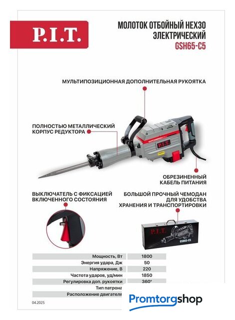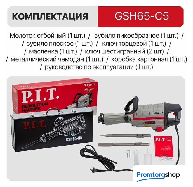 | Комплектация | - Молоток отбойный, - зубило пикообразное, - зубило плоское, - ключ торцевой, - масленка, - ключ шестигранный (2шт), - металлический чемодан, - щетки угольные, - руководство по эксплуатации. |