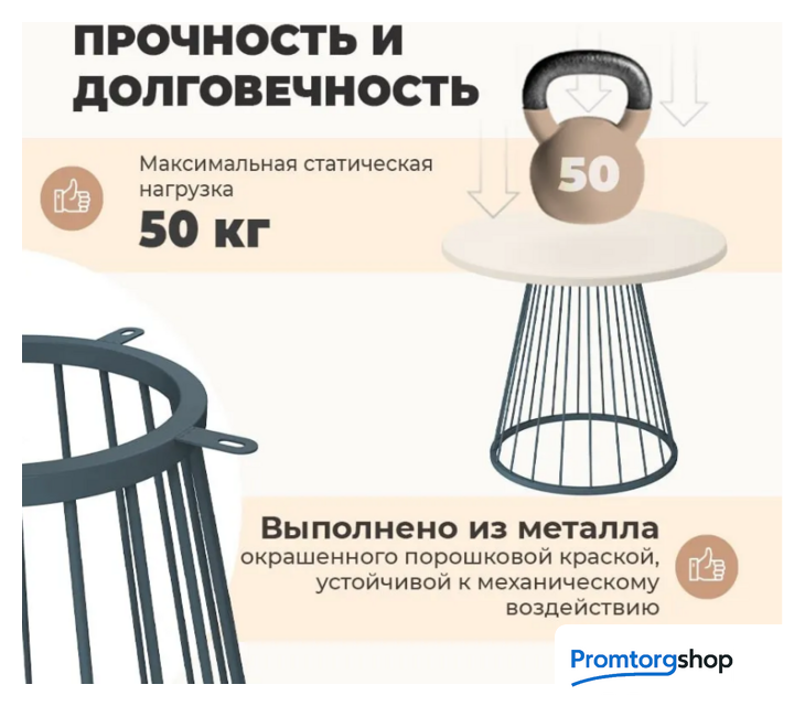 | Форма стола | круглая. Максимальная нагрузка 50 кг. Форма поставки в разобранном виде |