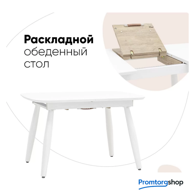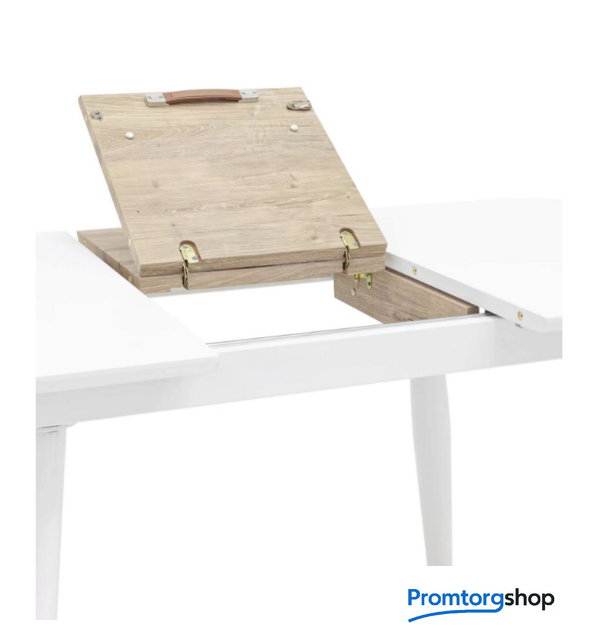 | Тип | обеденный стол для дома. Обеденный стол в прямоугольной столешницей. Цвет столешницы белый. Ножки металлические, покрашены в цвет светлого дерева.Подходит для большой компании, дополнительно раскладывается на 40 см.. Страна производства: Россия |