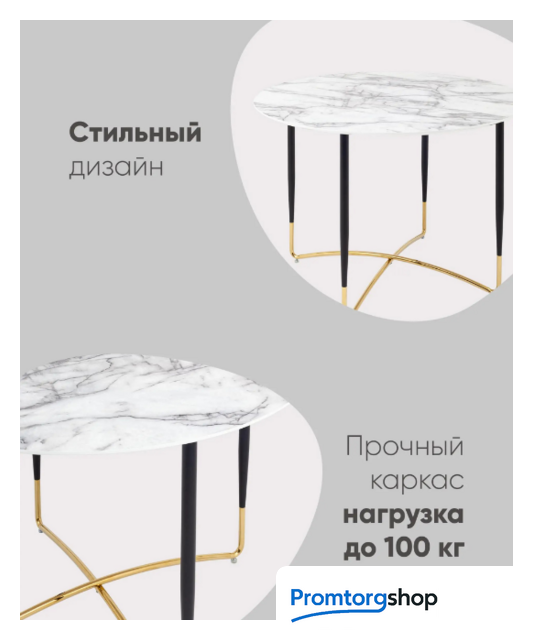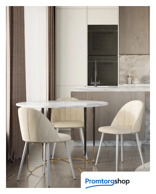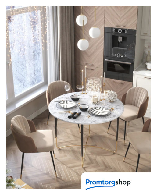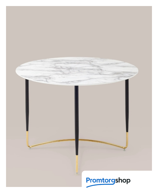 | Тип | Стильный обеденный стол с рисунком белого мрамора. Круглая столешница выполнена из МДФ — прочный, экологически безопасный материал, устойчив к перепадам температур и повышенной влажности. Поверхность столешницы декорирована под белый мрамор, который лаконично сочетается с золотыми ножками. Дизайн стола дополнит интерьер кухни, зала с любыми комплектами стульев в современном стиле. |
