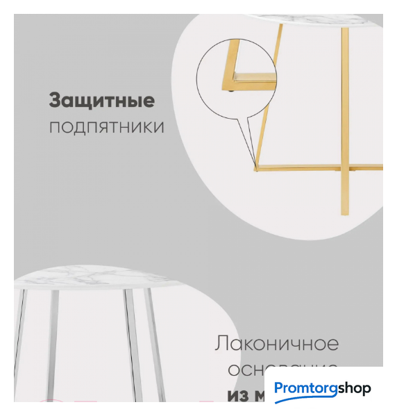 | Тип | Лаконичный обеденный стол для кухни. Круглая столешница с рисунком белого мрамора выполнена из МДФ — прочного, экологически безопасного материала, который устойчив к перепадам температур и повышенной влажности. Поверхность столешницы декорирована рисунком белого мрамора, который идеально сочетается с металлическими ножками в цвете хром. Защитные подпятники на ножках предотвращают порчу напольного покрытия. |