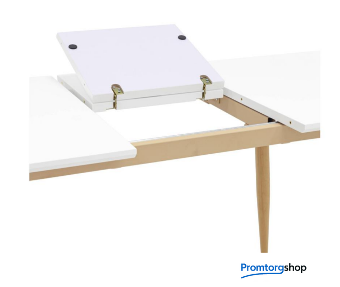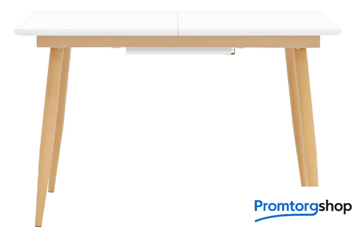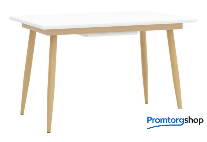 | Тип | обеденный стол для дома. Обеденный стол в прямоугольной столешницей. Цвет столешницы белый. Ножки металлические, покрашены в цвет светлого дерева.Подходит для большой компании, дополнительно раскладывается на 40 см.. Страна производства: Россия |