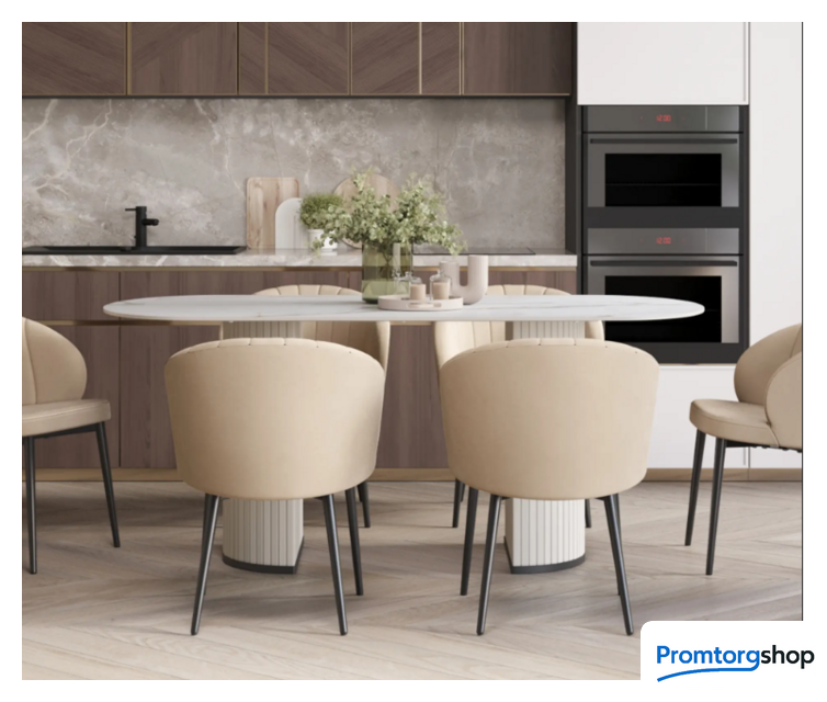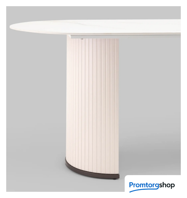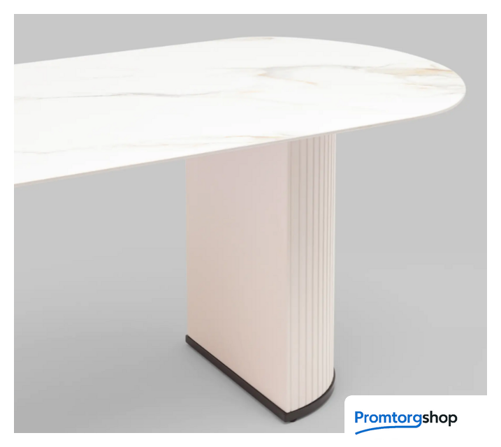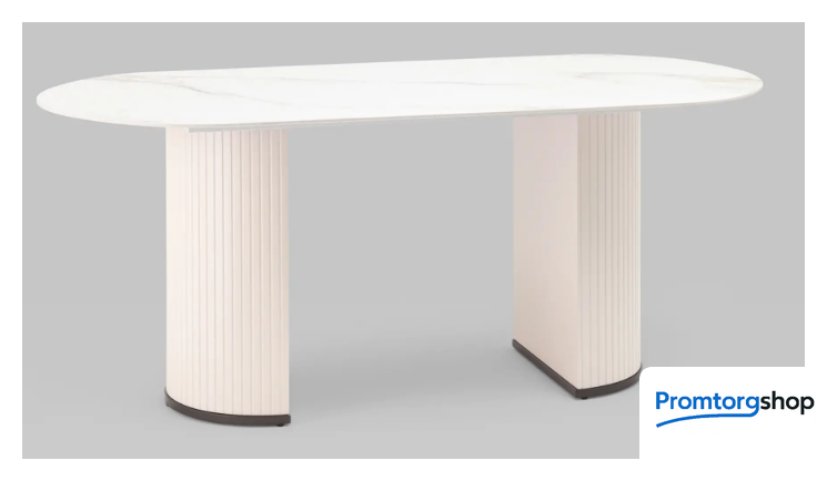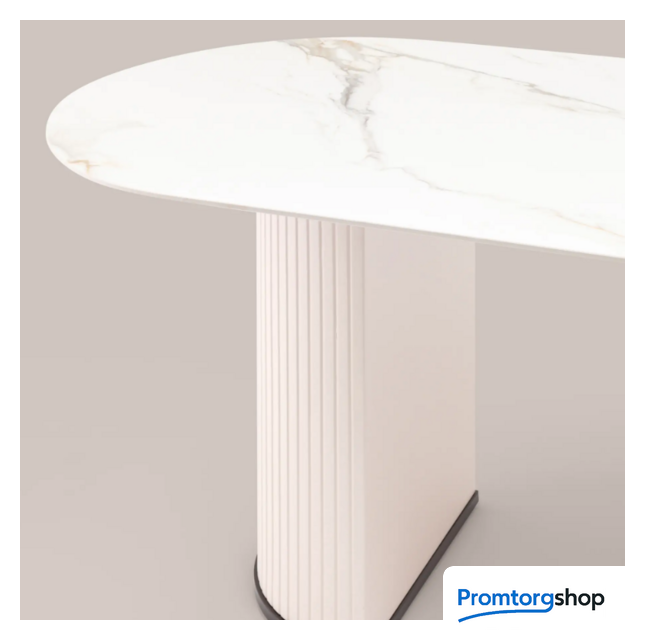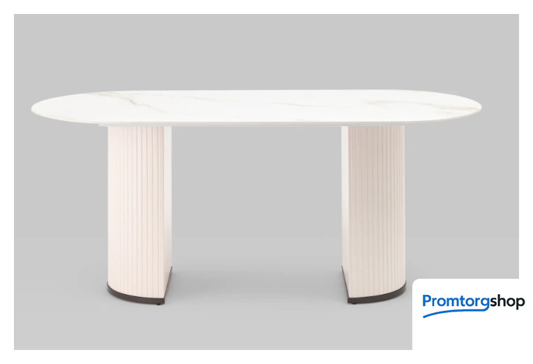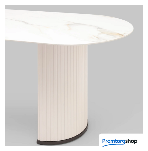 | Тип | обеденный стол для дома, для кафе/бара. Столешница из керамики — отличный вариант для кухни. Материал знаменит прочностью и долговечностью, поверхность устойчива к различным внешним воздействиям. Поверхность столешницы с рисунком белого мрамора гармонично сочетается с массивными ножками бежевого цвета. Простая овальная форма стола позволит легко вписать его в современный интерьер, стол украсит кухню, гостиную или современное кафе, ресторан. Опорные плиссированные ножки в лаконичном дизайне надежно удерживают всю конструкцию и дополняют монолитный образ. Страна производства: Россия |